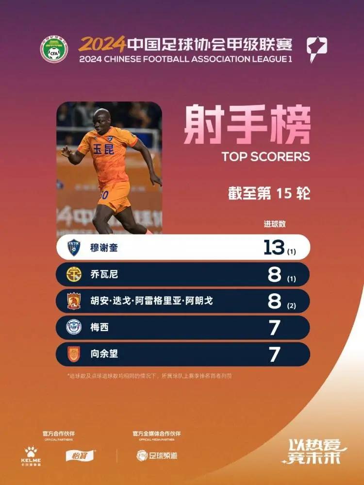 直播吧7月1日讯 联赛第15轮结束后,中甲射手榜再次更新。本轮在云南玉昆5-0大胜辽宁铁人的比赛中,穆谢奎再下一城,他也以13粒进球的数据继续领跑中甲射手榜。