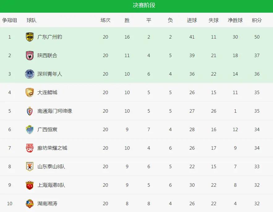 但广东广州豹积50分,依然以巨大优势占据领头羊位置,甩开排名第三的深圳青年人高达14分,在还剩8轮的情况下,直接晋级中甲只是时间问题。