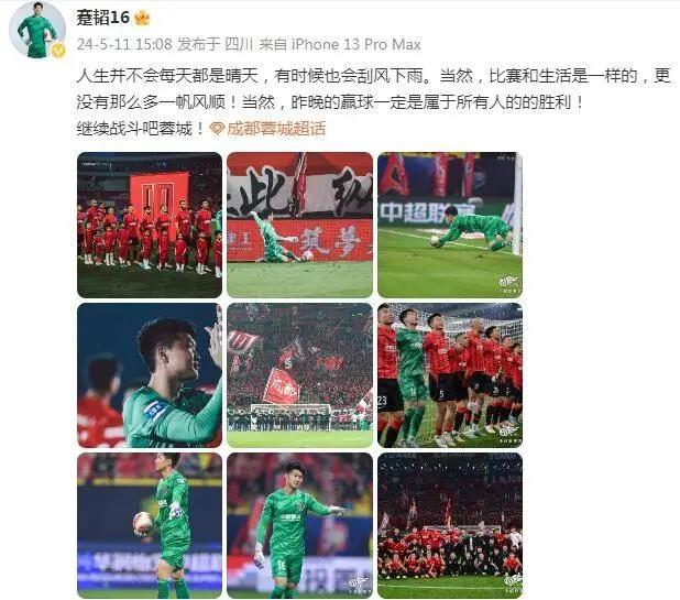 “人生并不会每天都是晴天,有时候也会刮风下雨。当然,比赛和生活是一样的,更没有那么多一帆风顺!当然,昨晚的赢球一定是属于所有人的胜利!继续战斗吧蓉城!”