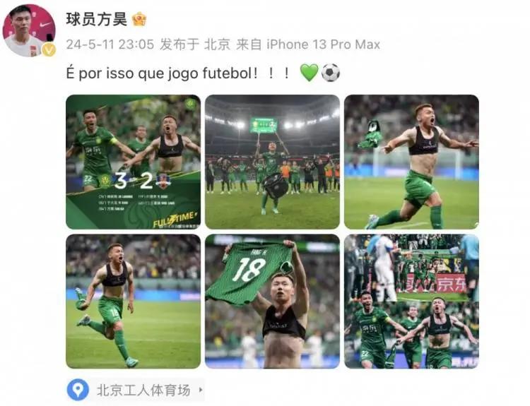 直播吧5月11日讯 今晚进行的中超第11轮比赛,国安主场3-2逆转击败梅州客家。赛后,攻入制胜进球的方昊在社媒用葡萄牙语进行了庆祝。