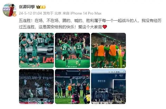 “五连胜!在场、不在场、踢的、喊的、胜利属于每一个一起战斗的人,我没有经历过五连胜,这是国安给我的快乐!爱这个大家庭。”