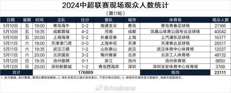 2024中超联赛现场观众人数统计(第11轮) ​​​