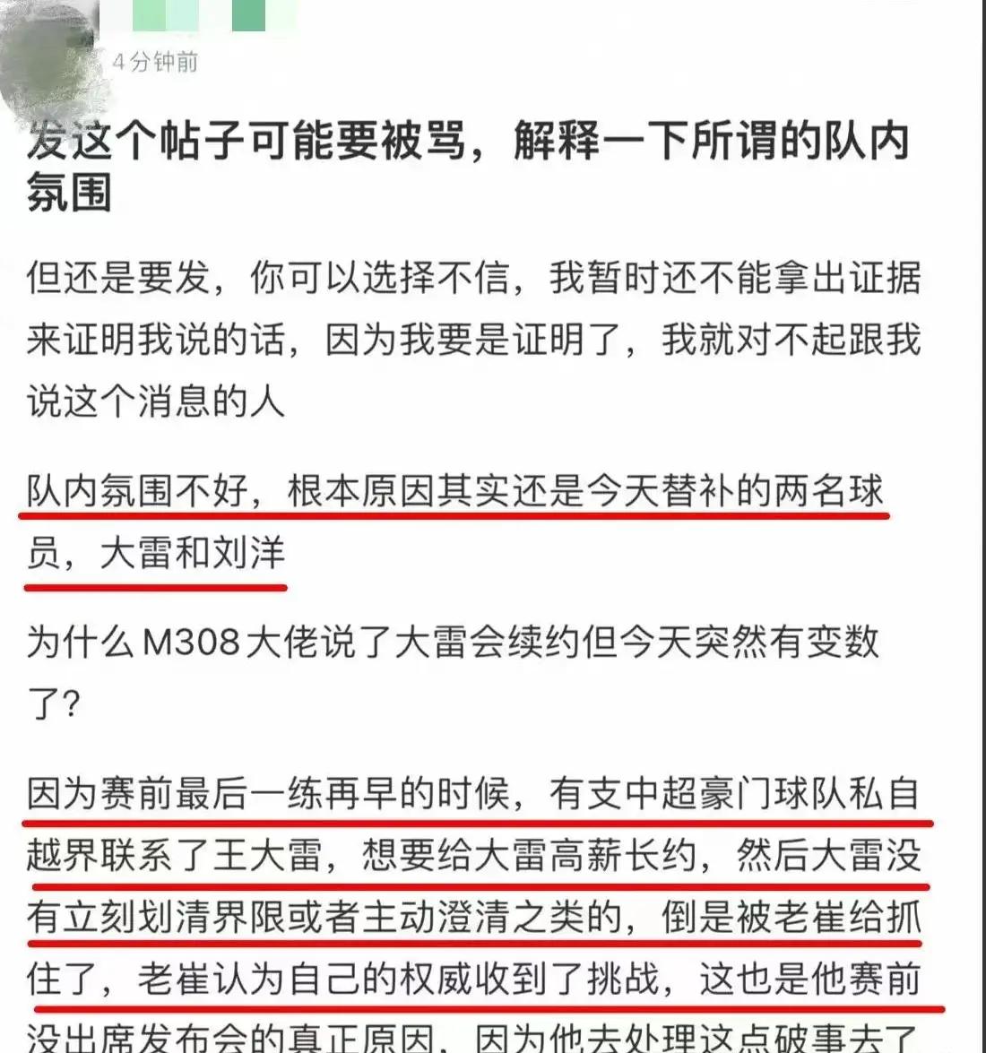在爆料中,该爆料人表示队内氛围不好,根本原因其实还是今天替补的两名球员,王大雷和留洋。在长文中,爆料人表示:因为赛前最后一练的时候,有支中超豪门球队私自越界联系了王大雷,想要给王大雷高薪长约,而王大雷并没有李可划清界限和主动澄清,到是给老崔抓到了,老崔认为自己的权威受到了挑战,这也是他赛前没有出席发布会的真正原因。