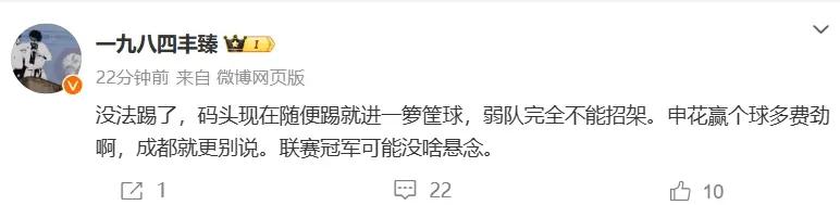 5外援+武磊,上港这种毫不讲理疯狂压上猛攻的踢法让记者丰臻惊叹(下图)。他在个人社交平台上表示:“这比赛真是没法踢了,上港现在随便踢就进一箩筐球,弱队完全不能招架。申花赢个球多费劲啊,成都就更别说。联赛冠军可能没啥悬念。”