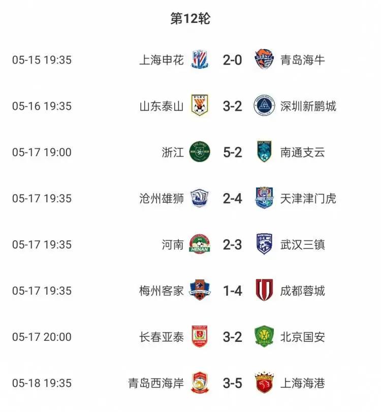 直播吧5月18日讯 随着今晚青岛西海岸vs上海海港的“进球大战”结束,中超第12轮全部比赛落下帷幕。
