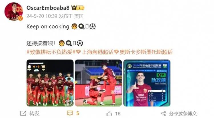 本赛季,奥斯卡代表海港出战10场中超联赛,其中9次首发,贡献了3个进球和8次助攻。