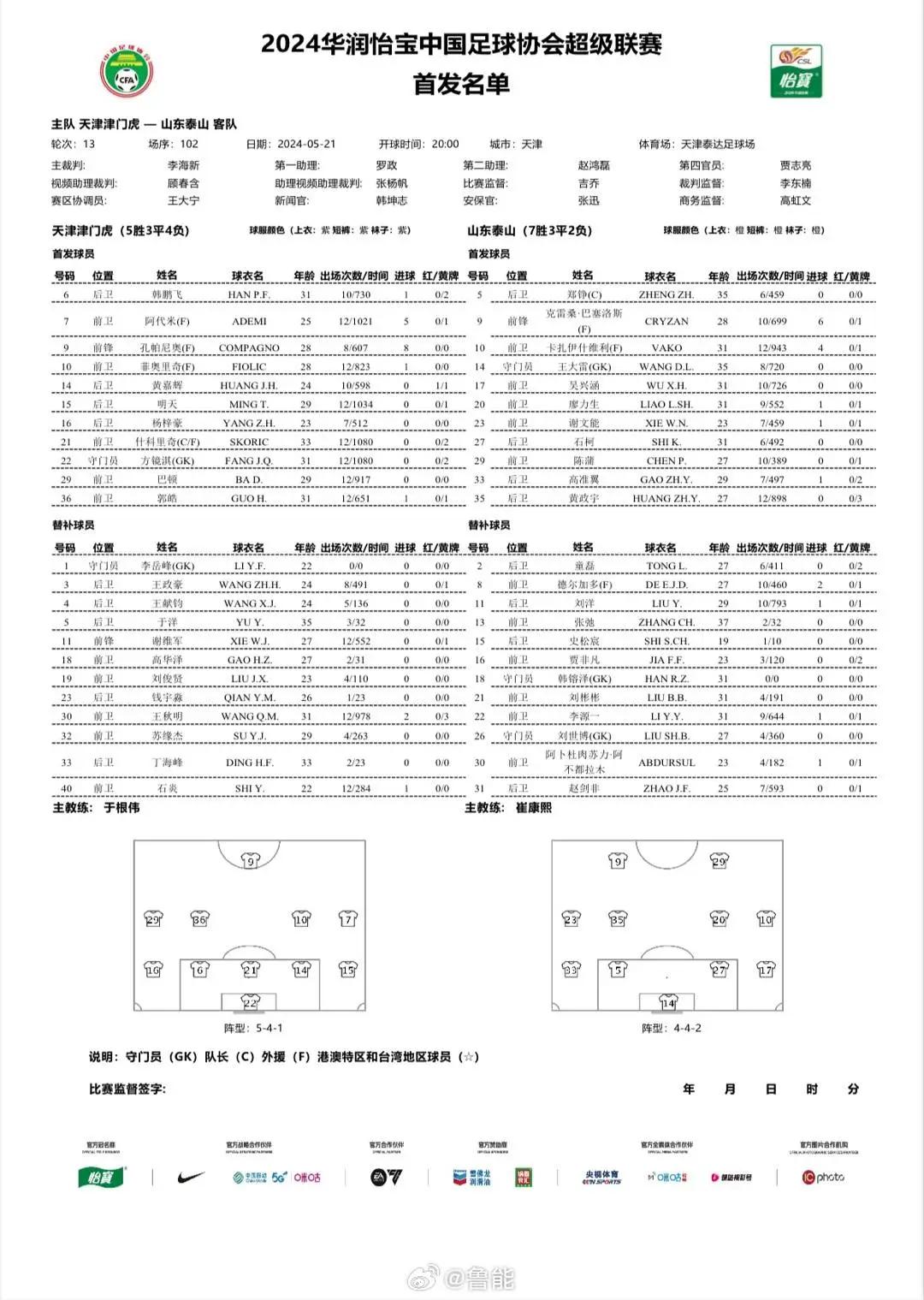 直播吧5月21日讯 今天20:00,中超第13轮,天津津门虎主场迎战山东泰山,赛前双方首发阵容出炉。