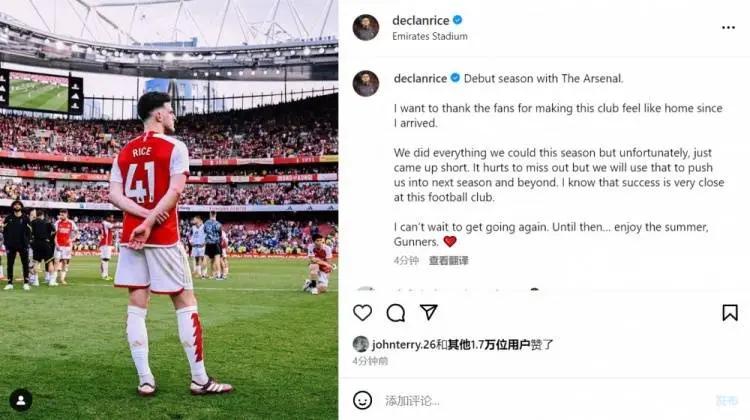 赖斯在个人社媒写道:“这是我在阿森纳的首个赛季,我想要感谢球迷们,自从我来到这里,他们让我在这家俱乐部有一种家的感觉。