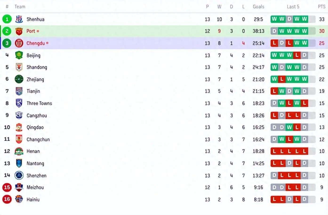 13轮全部结束,上海申花继续排名榜首,海港一波5连胜过后,仅仅落后申花3分,还少赛一场。蓉城输球、国安、泰山全部战平,第3到第5的球队积分相同,蓉城凭借净胜球排名第三。保级方面,梅州和海牛只有9分,另外还有3支球队积11分,相当混乱。
