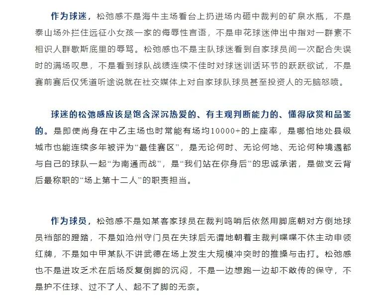 近日,一篇名为《享受足球,需要多一点松弛感》的文章火了。这篇文章是由中超球队南通支云队转载在自己的官方账号上的,在这篇文章里面,直接内涵了包括两支争冠球队,同时也中超老牌劲旅的上海申花、山东泰山队,还包括同为保级对手的青岛海牛等俱乐部。细数下来,这篇文章至少内涵了多达七家职业俱乐部。