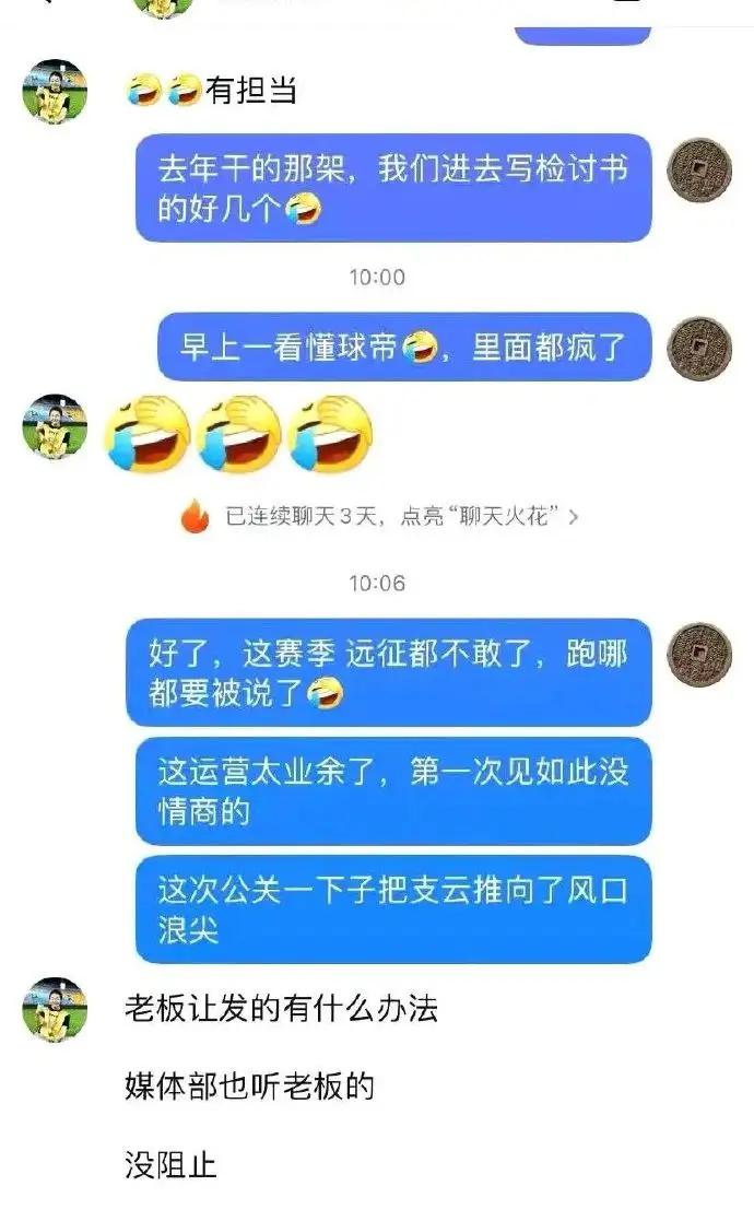 那么,为何南通支云队会有一个如此不正常的操作呢?有球迷贴出了聊天记录,爆料称这是球队老板的指示,这个锅不能由球队的传媒营销部来背。而随着这篇文章成为热点,可能意识到这样不太好的南通支云,现如今已经将这篇转载的文章进行了删除。