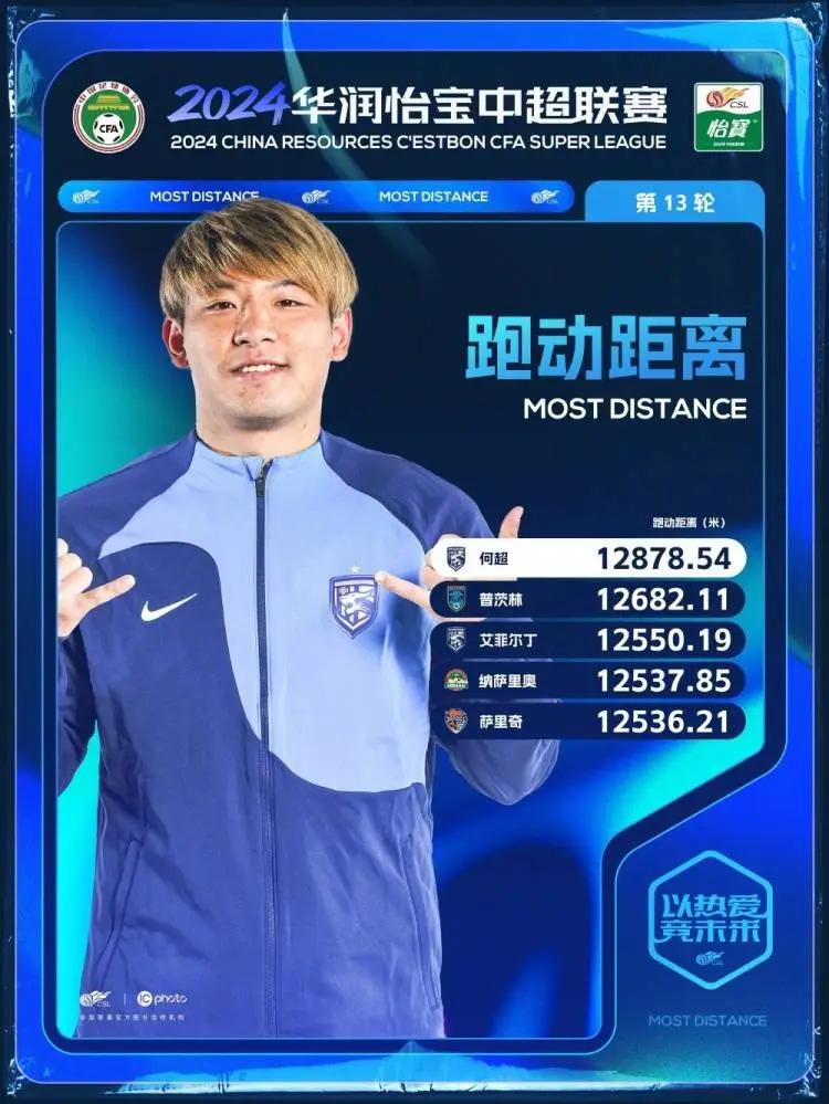 直播吧5月23日讯联赛第13轮结束后,中超官方公布了这一轮的跑动距离榜,排在榜首的是跑动12878.54米的何超,他的武汉三镇队友艾菲尔丁排在本期榜单的第三位。