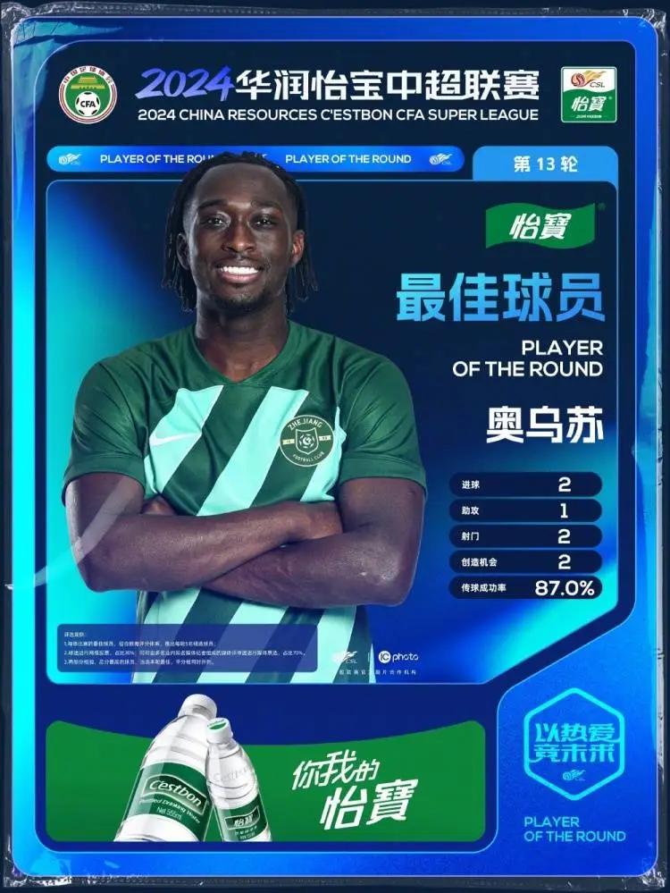 直播吧5月24日讯 联赛第13轮结束后,中超官方公布了本轮的最佳球员,浙江队外援奥乌苏当选。奥乌苏在媒体评审环节得到了13张第一顺位选票,以62分排名第一,最终以总分74分当选。