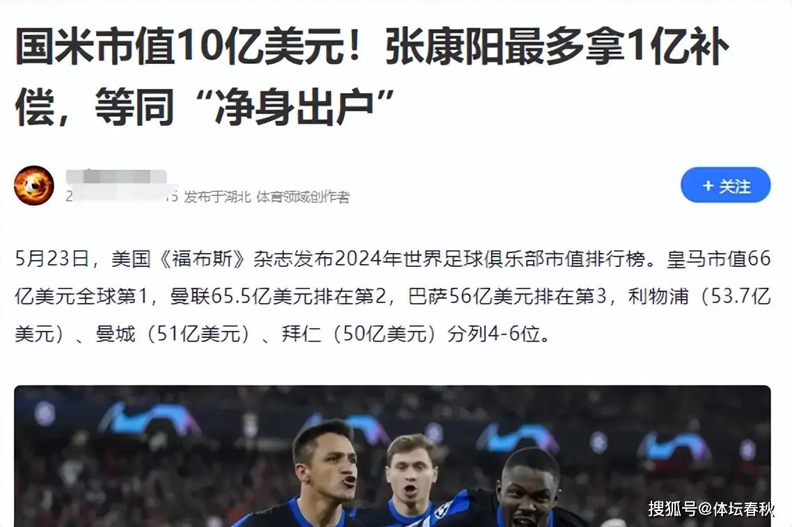 而在张康阳与国米挥手告别之际,一场精妙的商业操作悄然上演。据报道,国米俱乐部易主之后,原本压在张康阳肩上的债务被橡树资本接盘,他本人更是因为转让协议中的特别条款,获得了约1.2亿美元(折合人民币超过了8亿元)的高额违约金补偿。这一连串操作不仅巧妙地让张康阳从债务泥潭中脱身,更让他戏剧性的“华丽转身”。