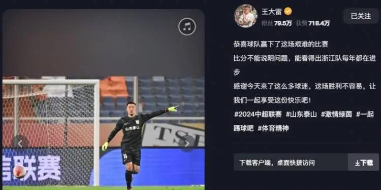 赛后,王大雷在社媒发文:“恭喜球队赢下了这场艰难的比赛,比分不能说明问题,能看得出浙江队每年都在进步。”