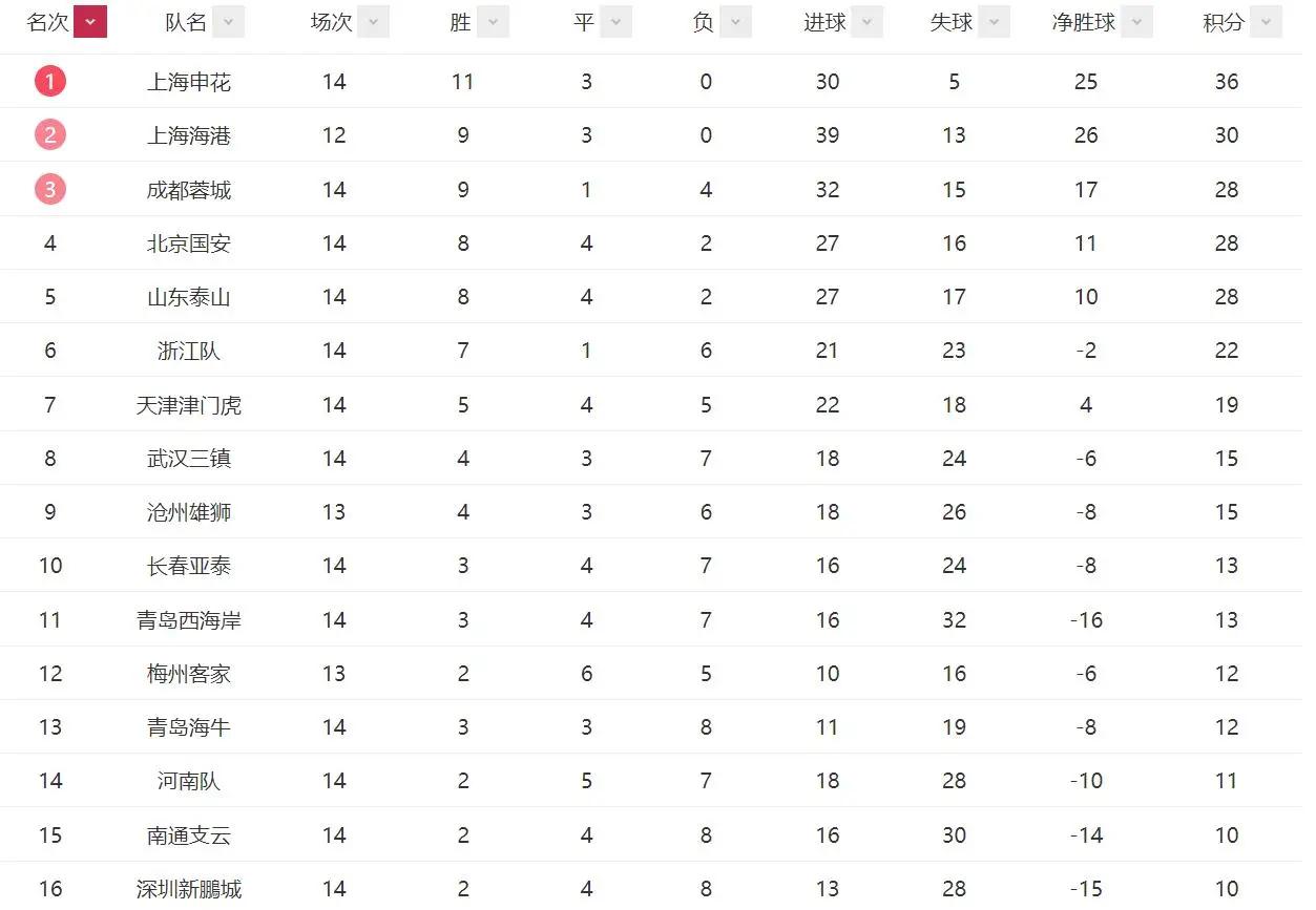 最新的积分榜上,前5名没有发生变化,申花继36分继续领跑,少赛一场的海港积33分紧随其后,国安、成都和泰山同积28分,泰山队以净胜球劣势暂时排名第5。保级的竞争非常激烈,深圳新鹏城和南通支云处于降级区,不过从垫底的深圳到第8的武汉三镇之间只有5分差距,保级区云集了9支球队。