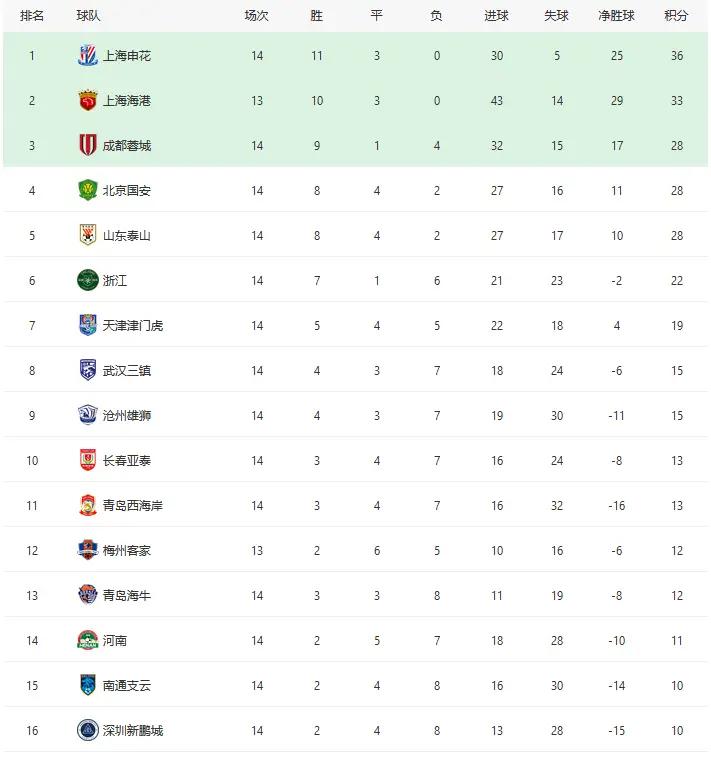 北京时间5月26日,中超联赛结束第14轮争夺,上海海港4比1击败沧州雄狮,紧追上海申花。上海申花客场1比0击败深圳,还是排名首位。成都蓉城7比0击败青岛西海岸,北京国安5比2击败南通支云,两队和泰山队同分。保级区,深圳输球后倒数第一,南通倒数第二。