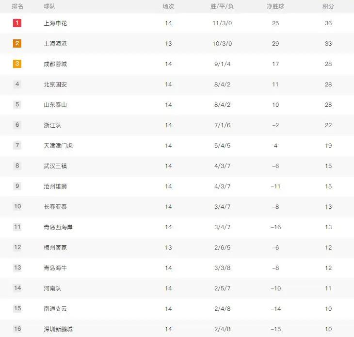 在积分榜上,申花11胜3平,积36分,暂列第一;海港10胜3平,积33分,暂列第二;蓉城9胜1平4负,积28分,暂列第三;国安8胜4平2负,积28分,暂列第四;泰山8胜4平2负,积28分,暂列第五。
