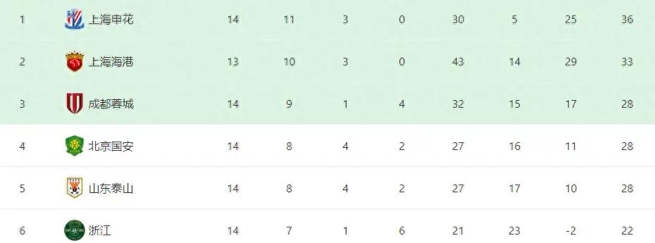 5月27日报道,中超第14轮已经全部结束,在积分榜前列的申花、海港、国安和成都全部取胜,新的排名也已经出炉,申花、海港、成都位列三甲。