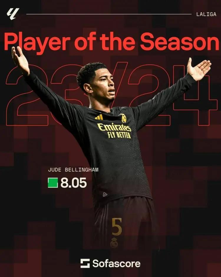 贝林厄姆当选Sofascore评选的西甲赛季最佳球员,他在23/24赛季西甲的数据如下: