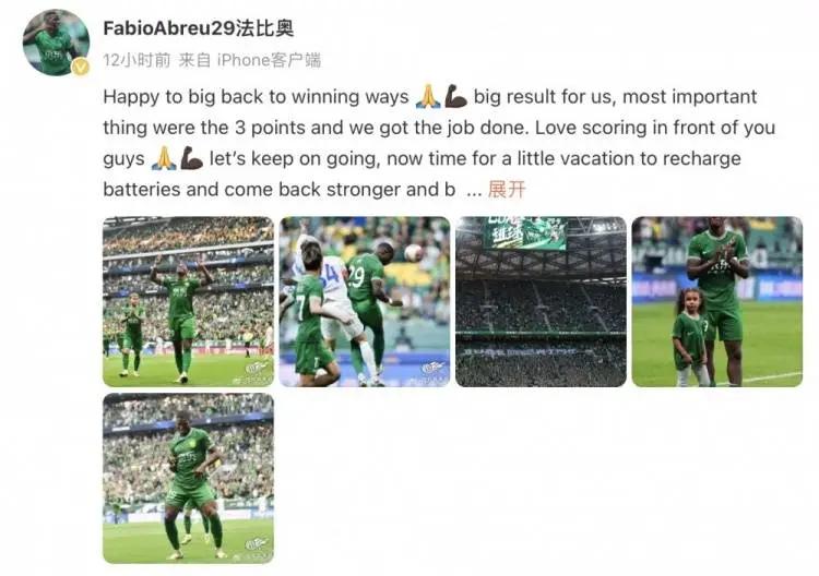 昨晚国安与南通支云的比赛,法比奥表现不俗,贡献2射1传一人独造3球。赛后,他更新社媒写道: