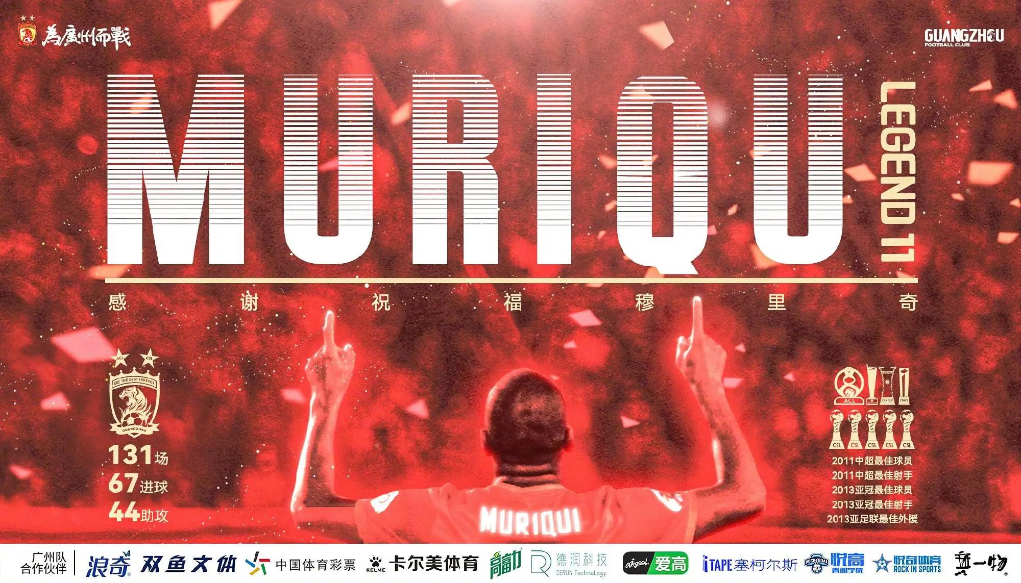 131场比赛、67粒进球、44次助攻这是穆里奇留给广州球迷最为珍贵的礼物,感谢穆里奇为广州球迷带来的激情与荣耀,5次中超冠军,1次亚冠冠军,1次足协杯冠军,1次超级杯冠军,1次中甲冠军,感谢你多年来的付出。祝你在未来一切顺利。