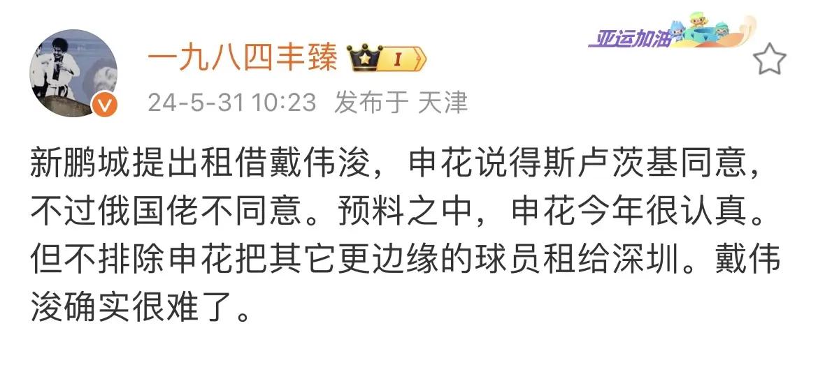 据媒体人丰臻透露,升班马深圳新鹏城提出租借戴伟浚的邀约,但是被主教练斯卢茨基拒绝。申花今年非常信任斯帅,人员的变动,要经过他的同意。戴伟浚今年中超、国家队双失意,联赛中连常规轮换球员都算不上,特谢拉受伤,斯卢茨基给过他一场首发机会,但始终游离在战术体系之外。球员自己的心态较好,没有因此放弃,斯帅不放人,其实是一件好事。