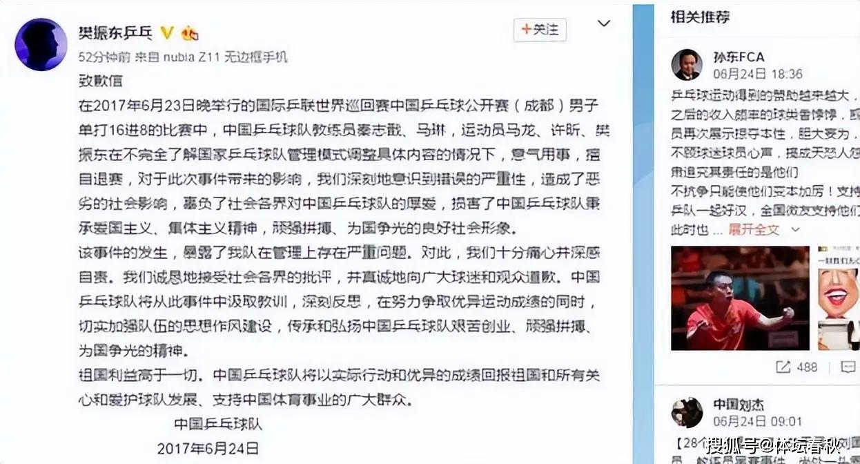 同时,孔令辉因卷入“赌场风波”被清理出国乒,此后他再也无法为国乒效力。而在刘国梁被调离国乒后,多位国乒的运动员和教练员集体发声,表达了对刘国梁调离的不满,并集体退出了2017年的国际乒联世界巡回赛中国站比赛,虽然这些队员和交流不久公开道歉,但还是在一定程度上帮助了刘国梁在第二年当选为中国乒协主席。