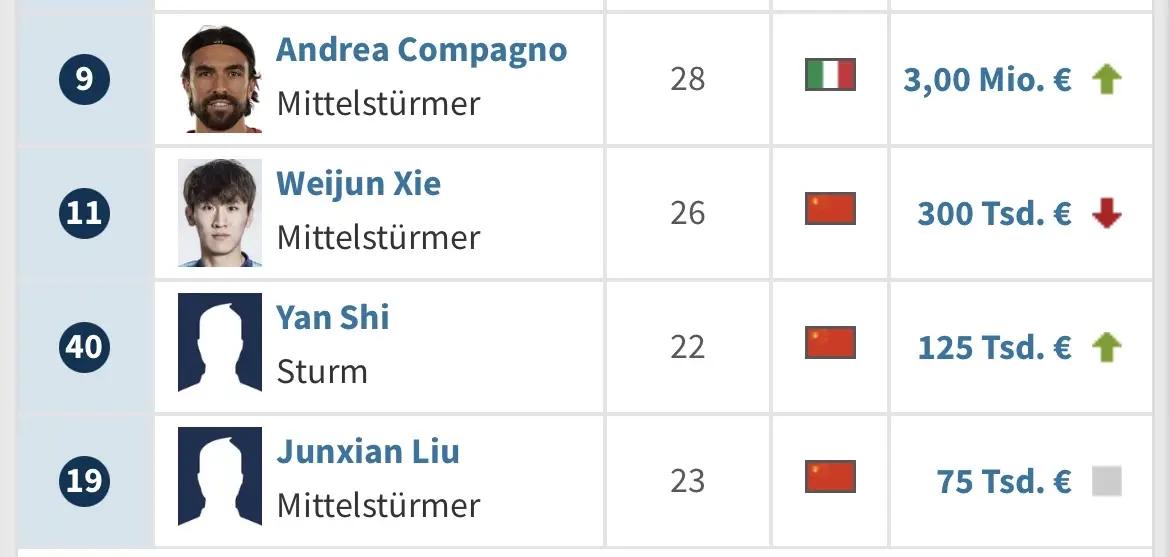 阿代米也略有涨幅,菲奥里奇则是下降了。最亏的无疑是泰山队的外援泽卡,100万欧元的身价,一场还没踢,已经下滑到了75万欧,赔了25万。山东泰山队当初签下他的时候,花费了190万欧,只能指望着他下半年复出,可以一步一步把自己的身价踢回来。克雷桑再度上涨,从350万欧上涨到了450万欧,按照目前的状态,赛季结束之后,有望突破500万欧。
