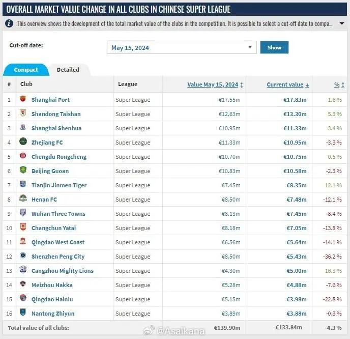 中超总身价1.3988亿欧元,较前上升1944万欧元,中超整体身价在全亚洲范围内,列在沙特、阿联酋、日本、卡塔尔、韩国之后,为第六位。