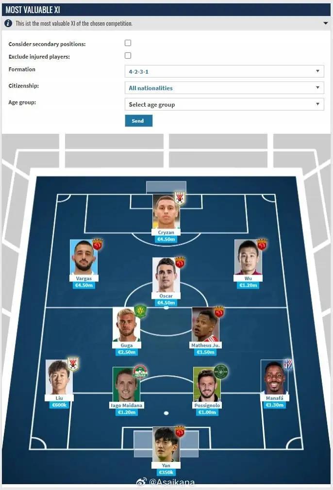 此次更新后,中超联赛最高身价为450万欧元,此前长期霸榜的奥斯卡已经被两人追上,奥斯卡、巴尔加斯和克雷桑三人并列第一;排第四的为浙江队莱昂纳多(350万欧元);第五为天津津门虎的坎帕尼奥(300万欧元);并列第六为成都蓉城队罗慕洛、北京国安古加(250万欧元);并列第八为长春亚泰的塞尔吉尼奥和深圳新鹏城的蒂亚戈·安德拉德(200万欧元);第十名为山东泰山的卡扎伊什维利(180万欧元)。