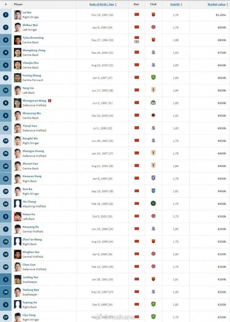 中超的中国籍球员里,武磊以120万欧元,继续保持第一;韦世豪、蒋光太以80万欧元并列第二;蒋圣龙以75万欧元排名第四;朱辰杰、张玉宁以65万欧元并列第五;第七名刘洋(60万欧);第八名王上源(50万欧);第九名谢鹏飞、高天意(45万欧)。