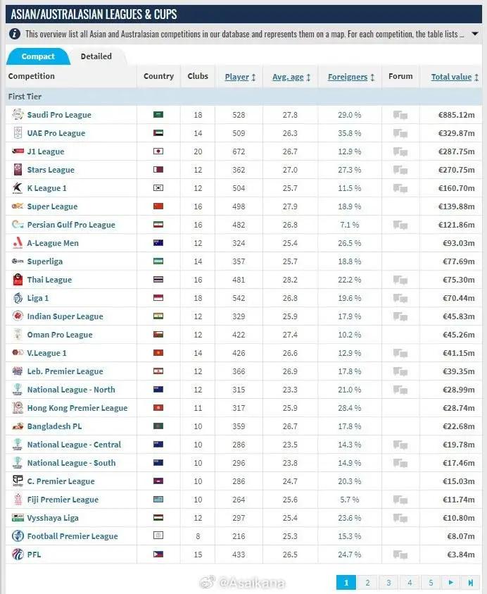 亚洲首位依旧是众星云集的沙特联赛,阿联酋、日本J1位居二三位,具体排名如下: