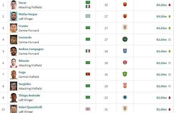 德国转会市场网站最新更新的中超球员身价榜单显示,海港外援奥斯卡、巴尔加斯和山东外援克雷桑以450万欧元并列第一。在前20名身价球员中,仅有武磊一名中国球员。令人欣喜的是,这些高身价球员中,有多达7人符合归化加入国足的资格,足协必须抓紧这一宝贵的机会。