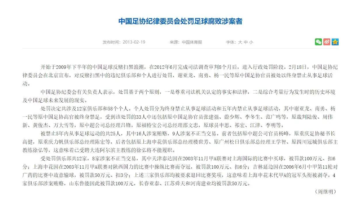 处罚决定共涉及12家俱乐部和58个个人。个人处罚分为终身禁止从事足球活动和五年内禁止从事足球活动,其中谢亚龙、南勇、杨一民等原中国足协高官被终身禁足,受到该处罚的33人中还包括原中国足协官员张建强、蔚少辉、李冬生、范广鸣等,原裁判陆俊、周伟新、黄俊杰、万大雪等,原中超公司总经理吕锋,原福特宝公司总经理邵文忠,原球员申思、祁宏、江津、李明等。