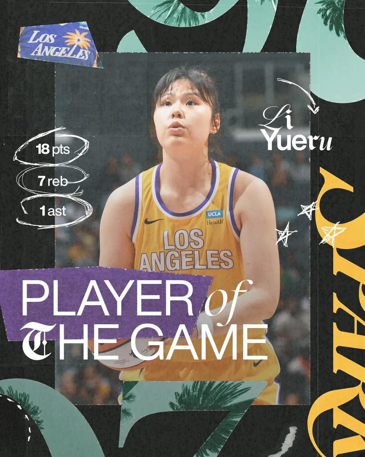 不过,整场比赛,李月汝出战24分钟,9投6中,6罚6中,拿到全队最高的18分,外加7篮板1助攻1抢断1盖帽,这也是她WNBA生涯得分新高,赛后被评为火花全场最佳。