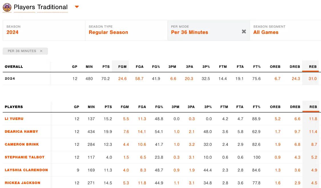 最近几场的出色发挥,李月汝本赛季在火花的数据已经提升至4.8分3.8篮板,要知道这还是在她场均上场时间仅有11.4分钟的情况下,如果换算成每36分钟,她场均可以拿下15.2分11.8篮板,每36分钟的场均得分仅次于汉比,远高于库里教妹布林克的12.3分,另外每36分钟的场均篮板则是全队第一。