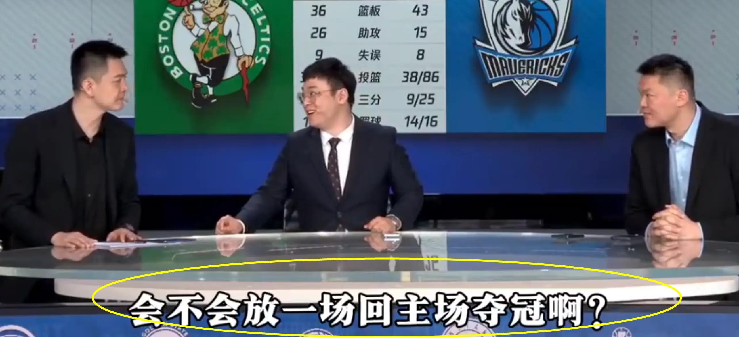 那么在这种情况下,俩人都是嘉宾,多多少少在解说比赛,在点评的时候是不是会有一些对抗和pk呢?你们俩得聊比赛,但正好刚刚在季后赛当过对手,肯定是有一点故事的。结果目前凯尔特人已经3:0了,现在第4场是在独行侠的主场,如果绿军愿意的话,有没有这么一种可能性,选择放一场回主场夺冠呢?