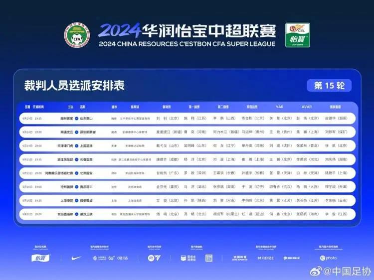 直播吧6月14日讯 中国足协官方公布中超第15轮裁判安排,艾堃执法申花战蓉城,傅明执法西海岸战三镇。