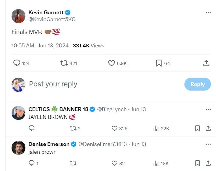 加内特也在G3布朗命中制胜一球后认同他就是FMVP。