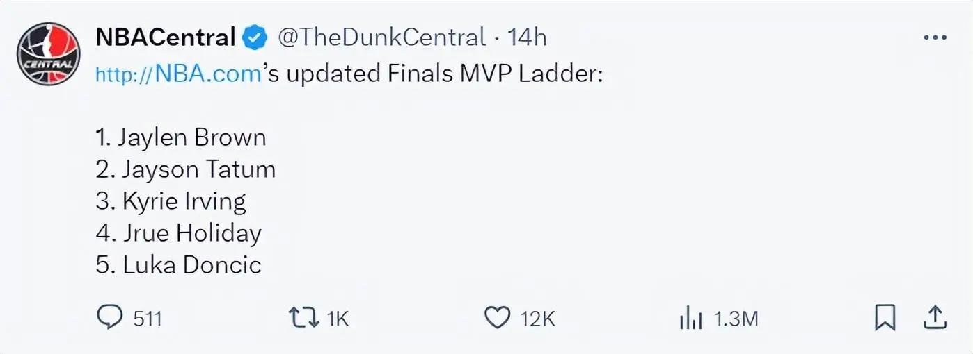 NBA官网的FMVP榜单,布朗已经升至第一,塔图姆第二,欧文第三。