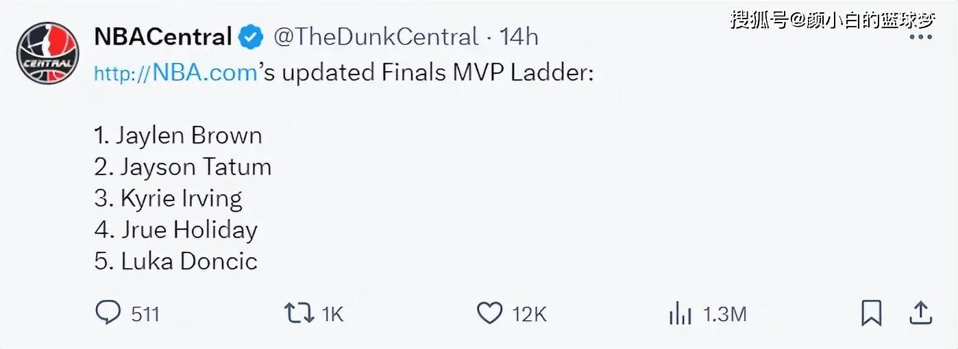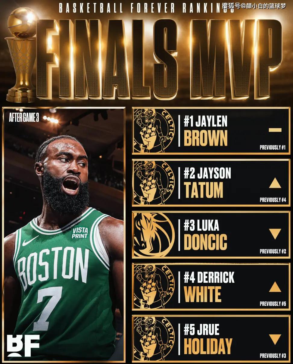 NBA官网的FMVP榜单,布朗已经升至第一,塔图姆第二,欧文第三。