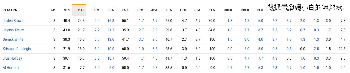 杰伦-布朗是总决赛发挥最稳定的选手,场均40.4分钟,拿到24.3分(第一)6篮板5.7助攻2抢断(第一)1.3盖帽(第二),命中率55.1%,三分命中率25%。