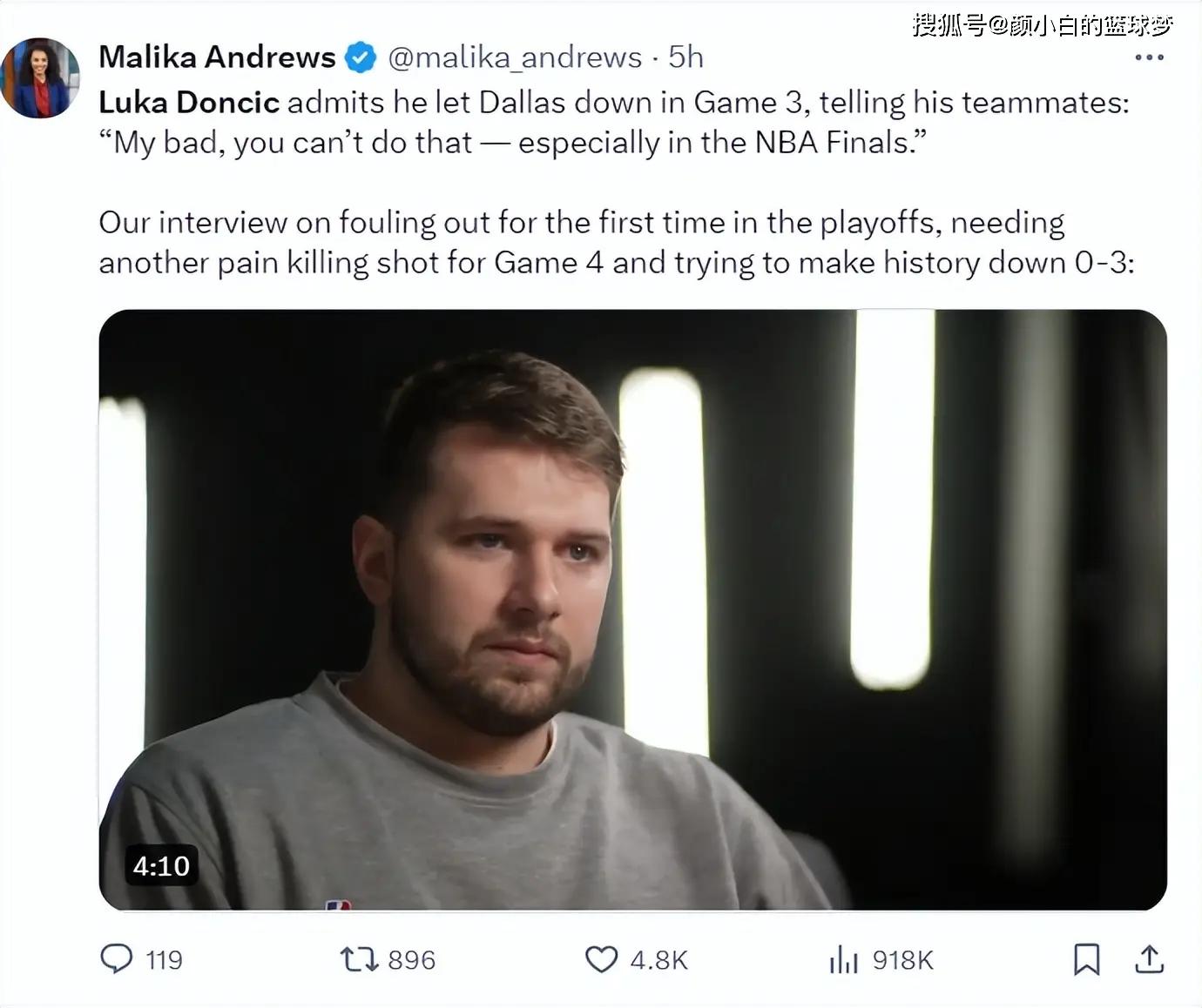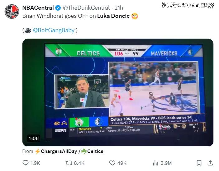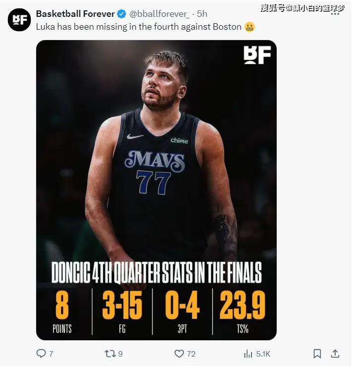 随后有美媒晒出,东契奇总决赛三场末节合计15中3+三分4中0拿8分,命中率20%,真实命中率23.9%,而前三节他合计拿下81分,命中率高达54%,他末节就隐身。