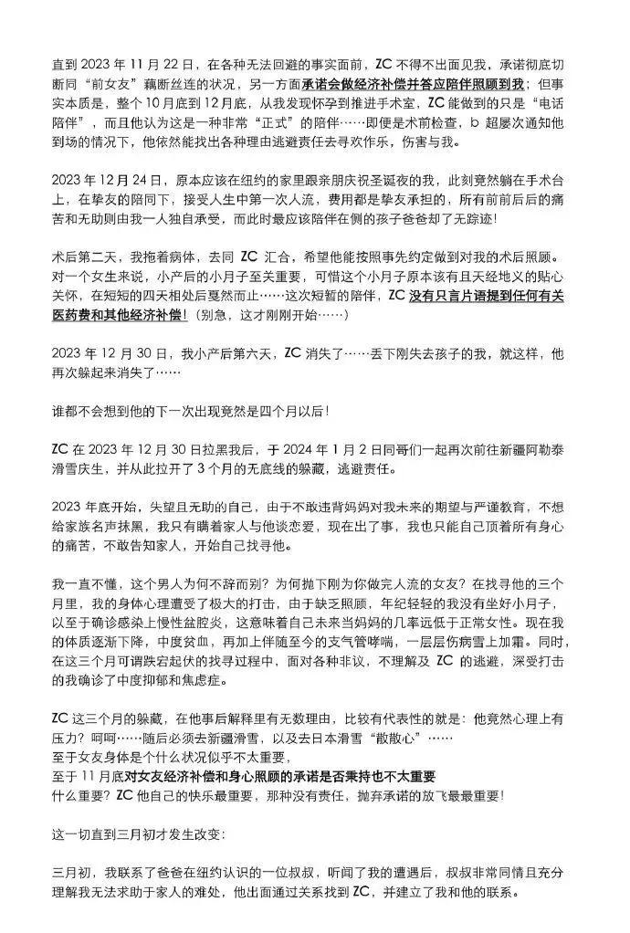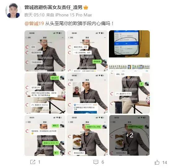 不过,球场上表现神勇的曾诚,没有想到的是,在如今却可能人设崩了。近日,社交媒体上一名id为“曾诚逃避伤害女友责任_渣男”的用户发出大量照片、聊天记录截图,指责前国门曾诚玩弄女性感情,让女伴堕胎后拒绝履行经济补偿的承诺,甚至拿家里继父去世的消息来欺骗该名女性以躲避责任。此消息一出,立即在网络上引起了球迷们的关注和讨论。我们先来看看这位博主写的超长“小作文”。