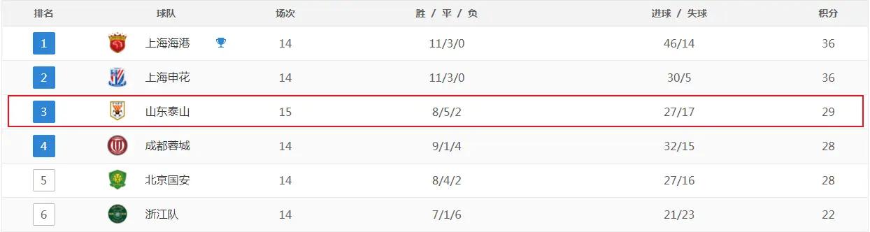 截至目前,泰山队8胜5平2负,积29分排在积分榜第三位,身前是上海海港和上海申花,身后是成都蓉城和北京国安。不过,球队比这些球队都多赛一场,单纯计算与上海海港对比的话,实际上积分又被多拉开了2分。虽然赛季很漫长,但泰山队想要争冠的话,难度明显是越来越大了。