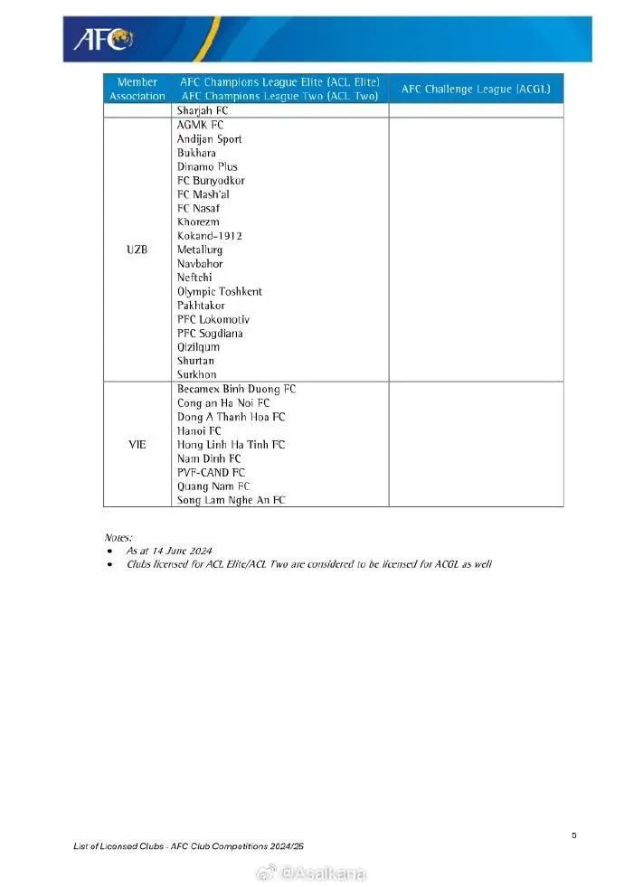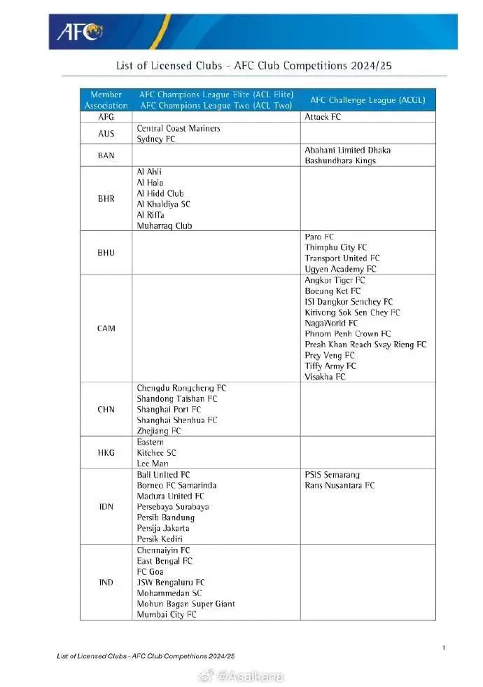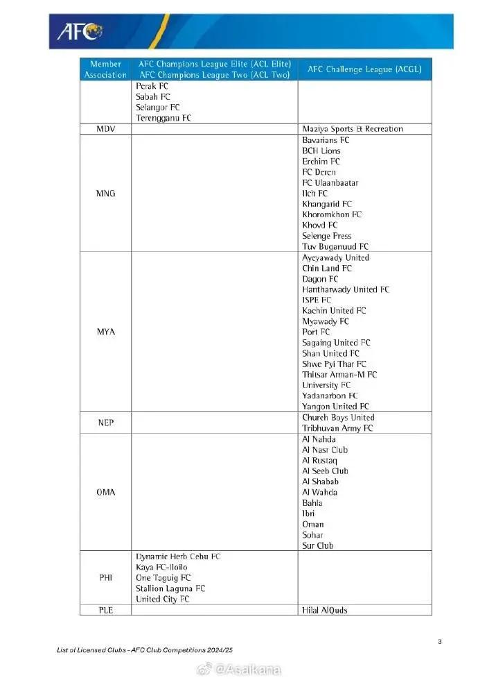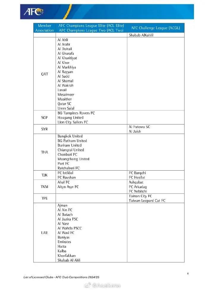 亚足联官方发布2024-25赛季亚足联俱乐部赛事准入结果: