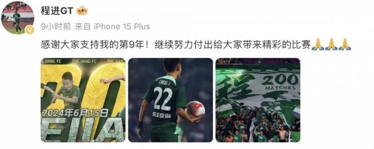 昨晚中超第15轮浙江队主场3-1逆转亚泰的比赛,是程进代表浙江队的第200场里程碑。赛后,他在社媒发文写道:“感谢大家支持我的第9年!继续努力付出给大家带来精彩的比赛???”