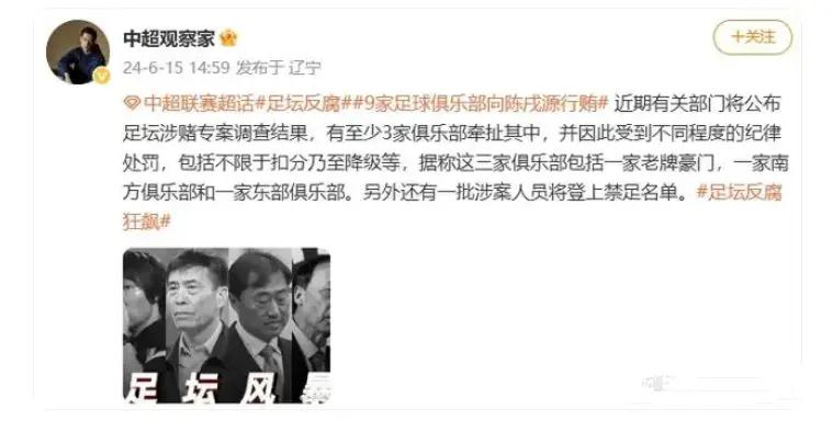 而在中国国足意外进入了世预赛亚洲区18强后,知名的体育人“中超观察家”也是在社交媒体上透露了足坛风暴的情况,在社交媒体上,“中超观察家”以9家俱乐部向陈码头送钱为标签爆料:近期,有关部门将公布此前的调查结果,有至少3家俱乐部牵扯其中,并因此受到不同程度的纪律处罚,包括不限于扣分乃至降级,据悉,这三家俱乐部包括了一家老牌豪门,一家南方俱乐部和一家东部俱乐部,另外还有一批相关人员将被禁足。