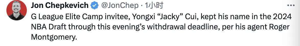 终于等来了官方确认,崔永熙的美方经纪人Roger Montgomery亲承他会留在今年的NBA选秀当中。